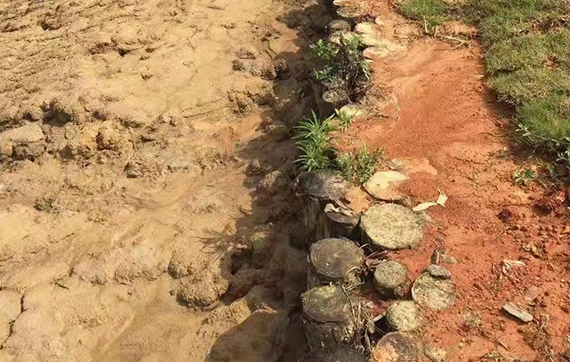 改造魚塘,堤壩用木樁加固為了穩(wěn)定壩的基礎(chǔ),兩邊用松木樁固定;相對(duì)來(lái)說(shuō)木樁成本較低。